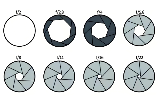 光圈的作用类似于人的瞳孔,能够控制进入镜头的光量多少。我们通常用 F 值来表示光圈大小,常见的 F 值有 F2.8、F4、F8、F16 等。
