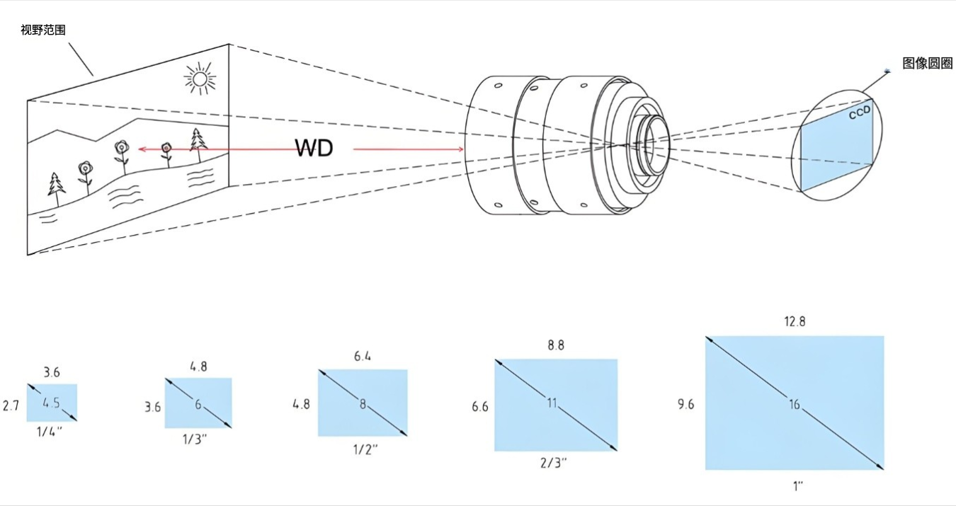 靶面其实就是镜头在相机感光芯片上所能形成的最大成像尺寸。常见的靶面规格包括 1.2 英寸、1 英寸、2/3 英寸、1/1.8 英寸等。