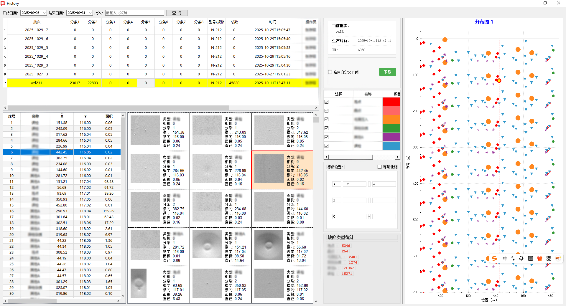 报表驱动决策:生成EXCEL、PDF等格式的缺陷明细报表,支持打印和存档,为生产流程优化和质量管理提供数据支撑,例如在分切环节精准分配不同质量要求的用途。如图为本系统历史记录页面: