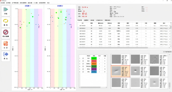 系统界面左侧实时展示缺陷类型、坐标与尺寸信息,右侧同步呈现检测图像与缺陷局部放大图与数据报表,支持历史记录查询与数据分析。